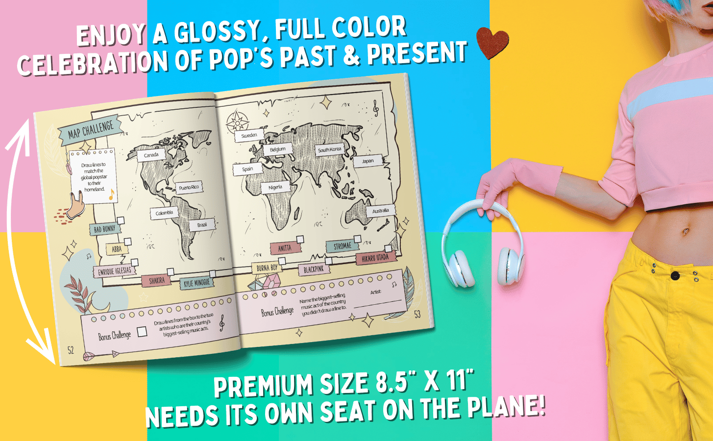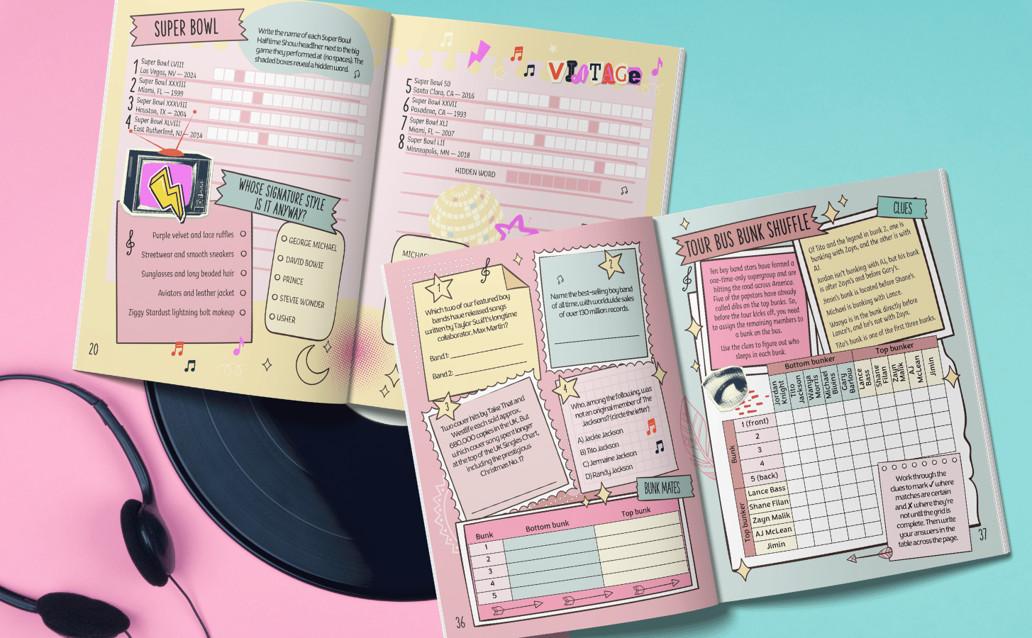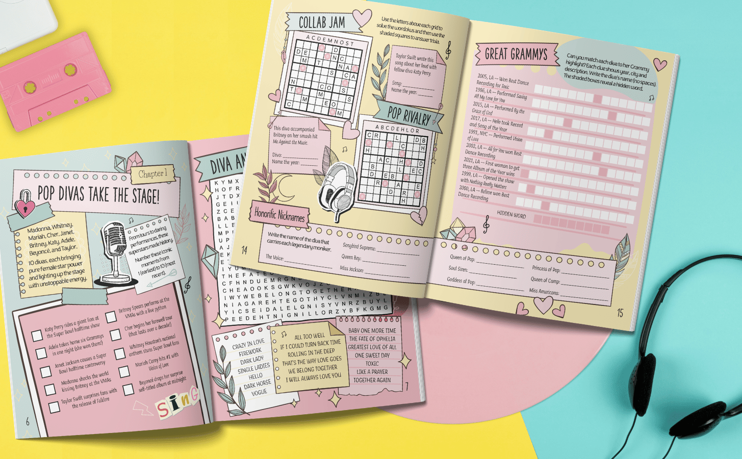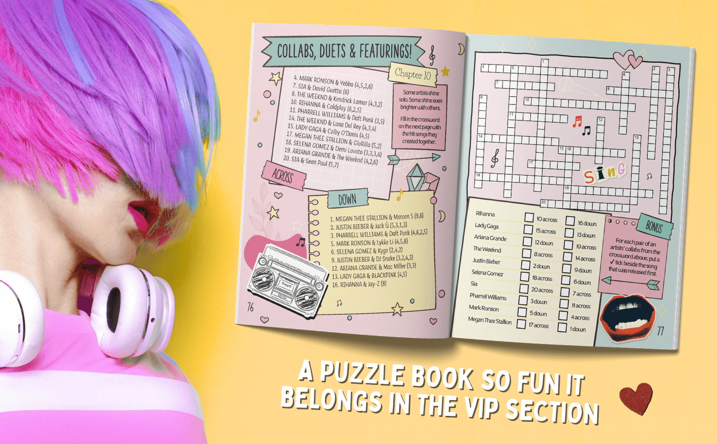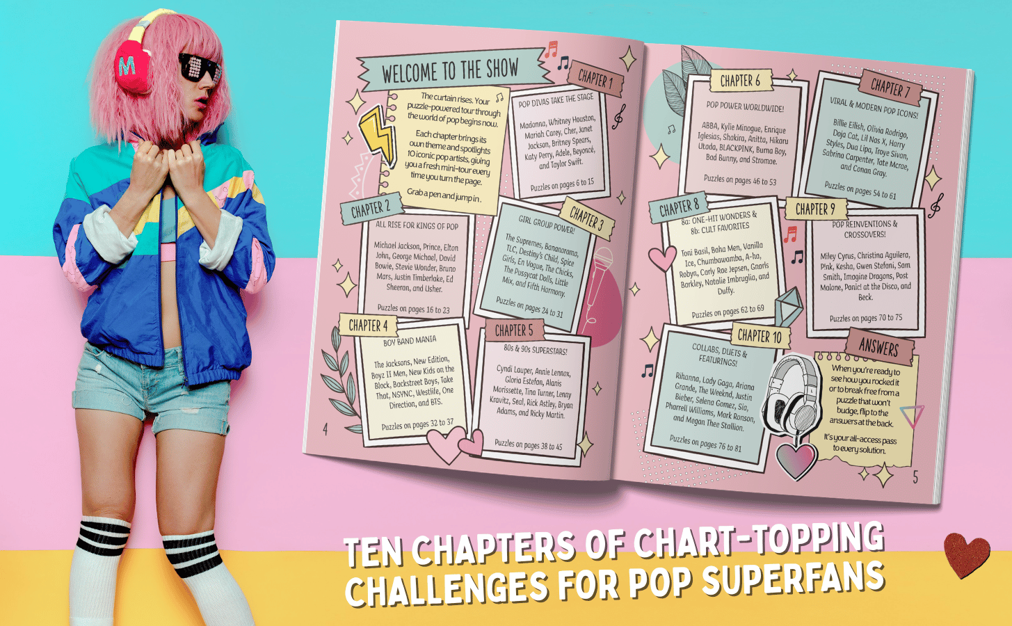 Across ten gloriously indulgent chapters, you’ll dive into puzzles inspired by chart‑toppers, hit‑makers, girls groups and boy bands, viral sensations, one-hit wonders, and more. Basically the entire glittering universe of modern pop.